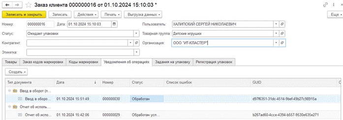 Если в заказе использовались схемы упаковки с фиксированным количеством товаров во вложении, то агрегации можно создать автоматически. Все полученные для этого заказа коды маркировки будут распределены по транспортным упаковкам, для которых будут автоматически сгенерированы коды упаковок (SSCC).