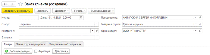 Создаем новый заказ клиента. На вкладке Товары проверяем, что не стоит галка Агрегация.