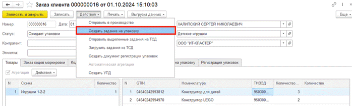Если коды маркировки подлежат упаковке, то необходимо создать задания на упаковку. Для этого нажимаем кнопку Действия – Создать задание на упаковку.