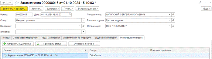 Для этого нажимаем Действия – Автоматическая агрегация. На вкладке Регистрация упаковок будут отображаться созданные упаковки.