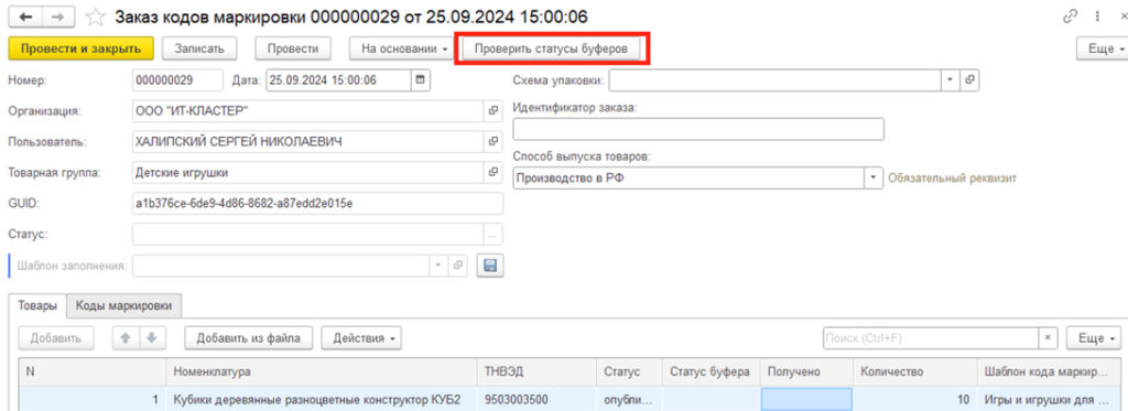 После успешной отправки заказа заполняется его идентификатор и появляется кнопка проверки статуса буферов.