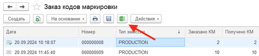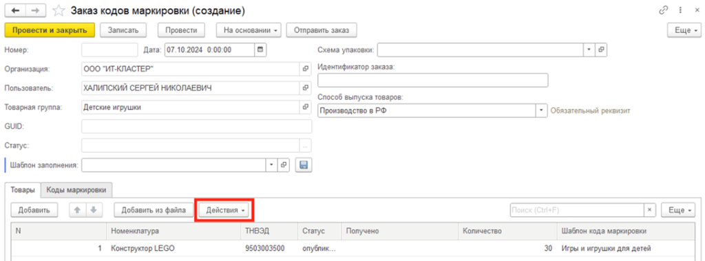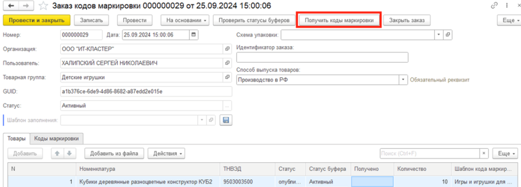 Создаем или открываем документ Заказ кодов маркировки