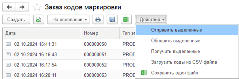 В разделе Заказ кодов маркировки предусмотрены Действия с выделенными документами: