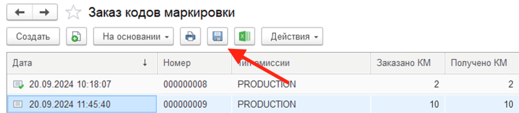 Сохранение кодов маркировки из документов заказа