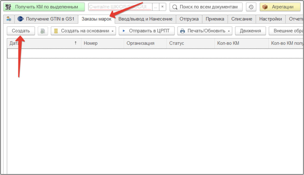 Перейдите на вкладку «Заказы марок» и создайте новый документ