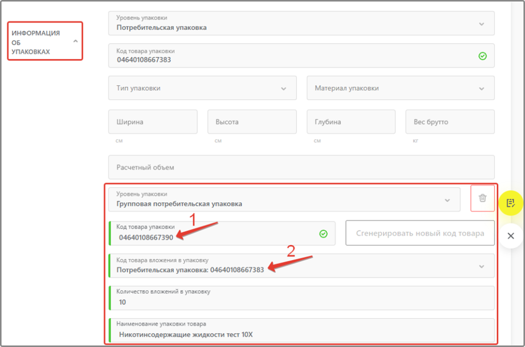 - Вы можете агрегировать в групповые упаковки только те товары, коды которых были указаны как «вложения» в групповую упаковку в карточке товара, обозначенного как групповая упаковка и имеющая информацию о групповой упаковке в «информации об упаковках»