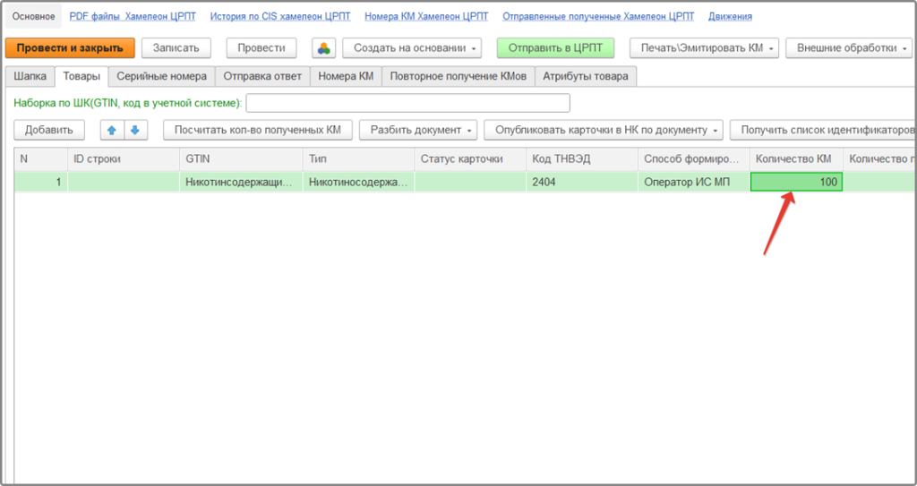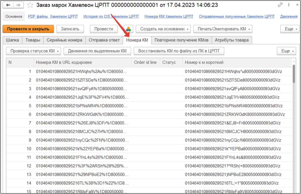 После успешной обработки, документу будет присвоен статус «Обработан», на вкладке «Номера КМ» будут также отображены все марки групповых упаковок