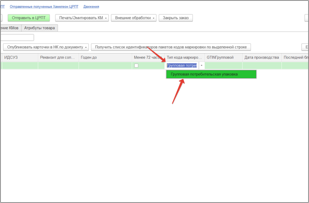 И укажите значение «Групповая потребительская упаковка» в поле «Тип кода маркировки»