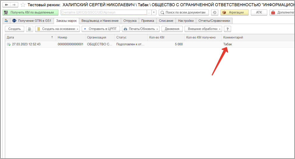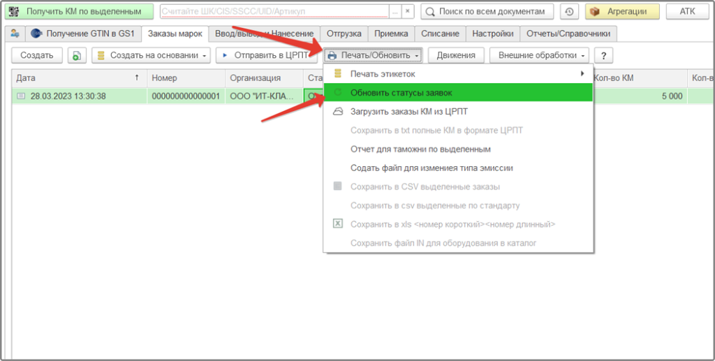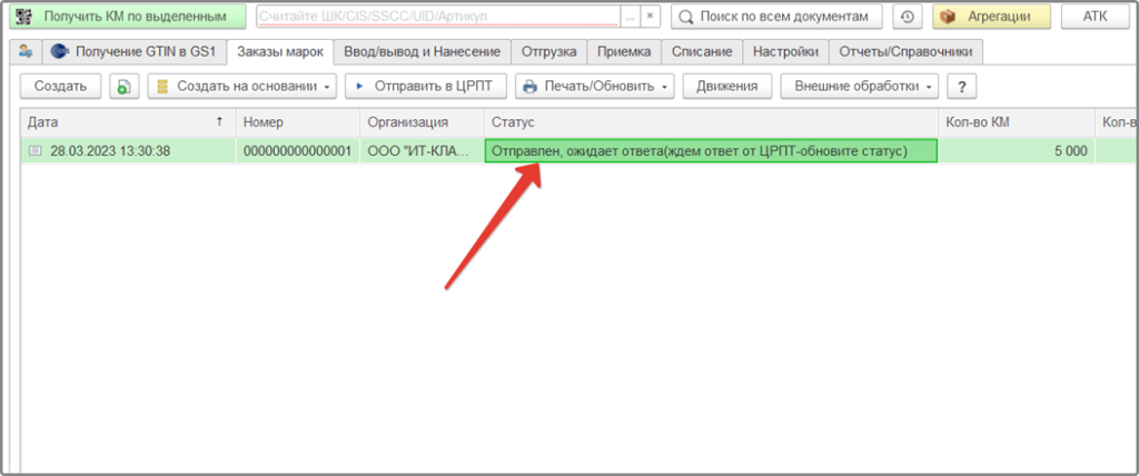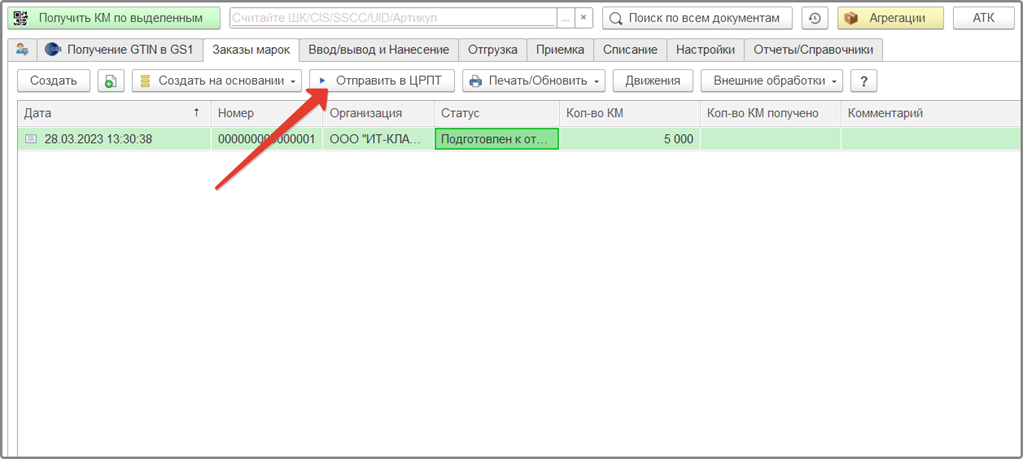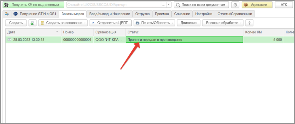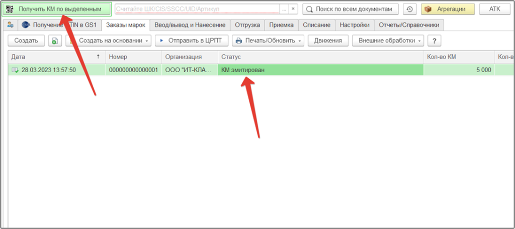 Теперь нужно эмитировать коды. Снова выделите документ и нажмите на кнопку «Получить КМ по выделенным». После получения кодов, статус изменится на «КМ эмитирован»