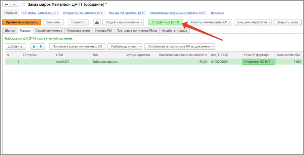 Затем отправляем документ в обработку, нажав «Отправить в ЦРПТ» в верхней части документа