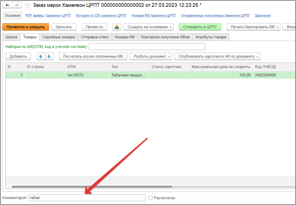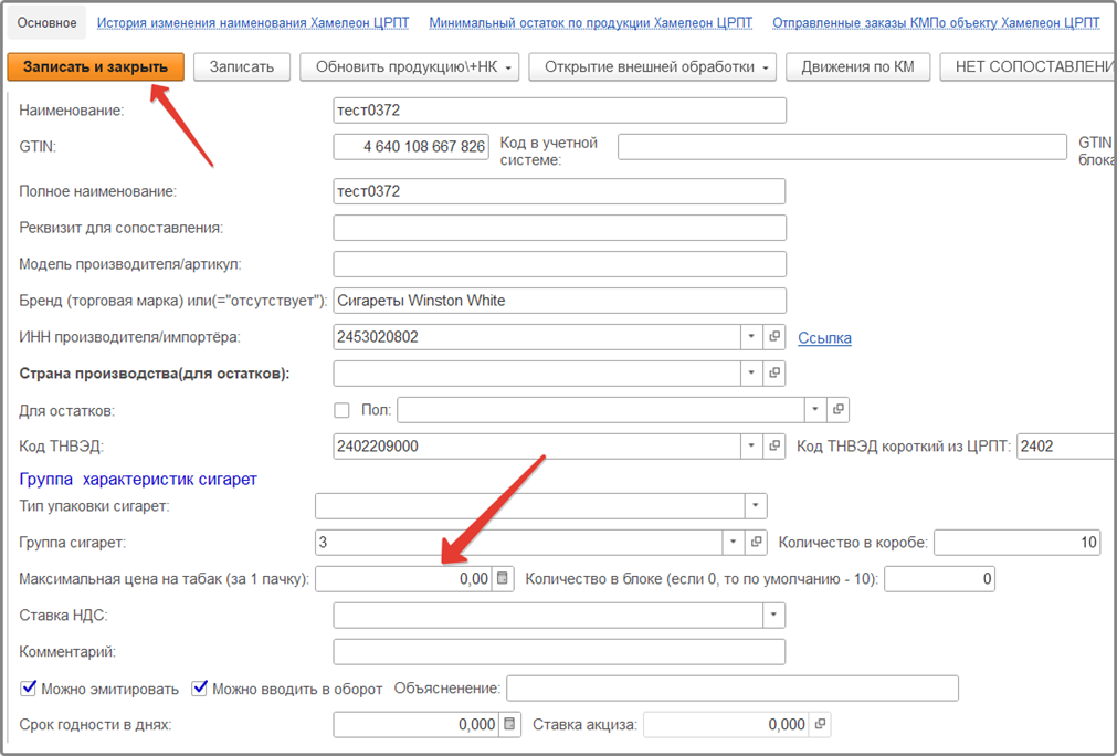 Откроется окно карточки товара. В низу найдите поле «Максимальная цена на табак (за 1 пачку)», укажите цену и закройте окно нажав «Записать и закрыть»