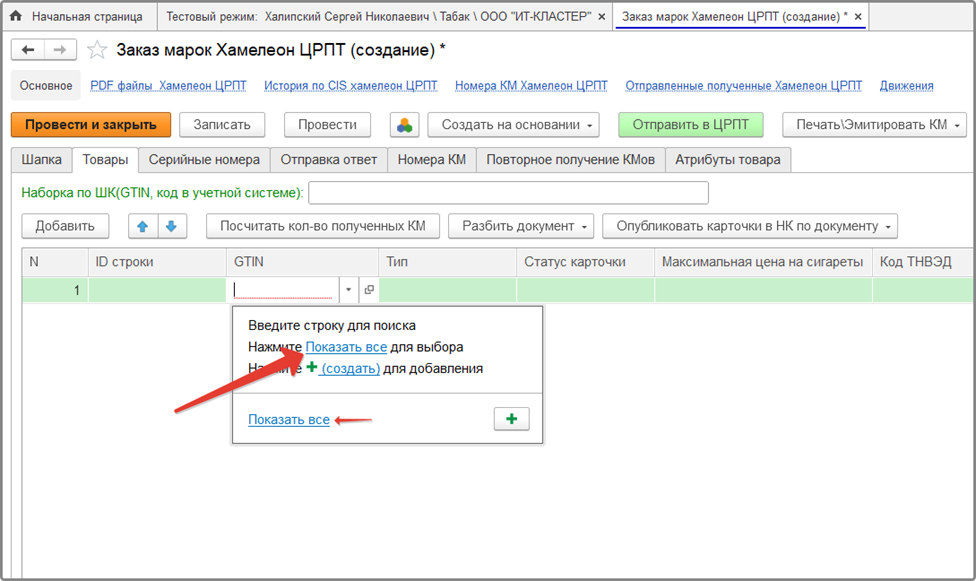 В данном случае, если для работы указана товарная группа «Табачная продукция (Табак)», нужно выбрать товар, принадлежащий этой группе.