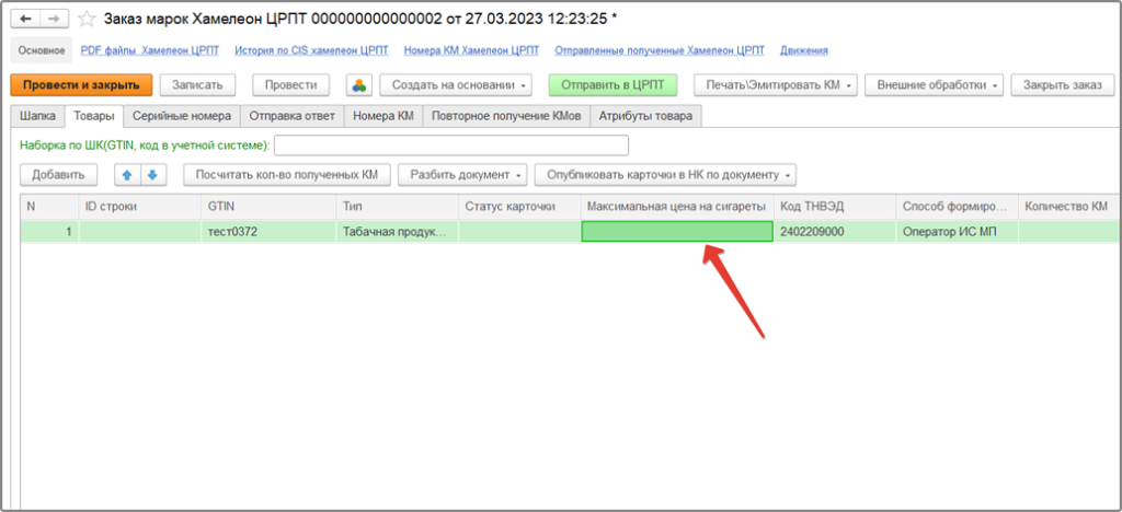 В табличной части документа будет создана строка товара. Теперь нужно заполнить параметр «Максимальная цена на сигареты»