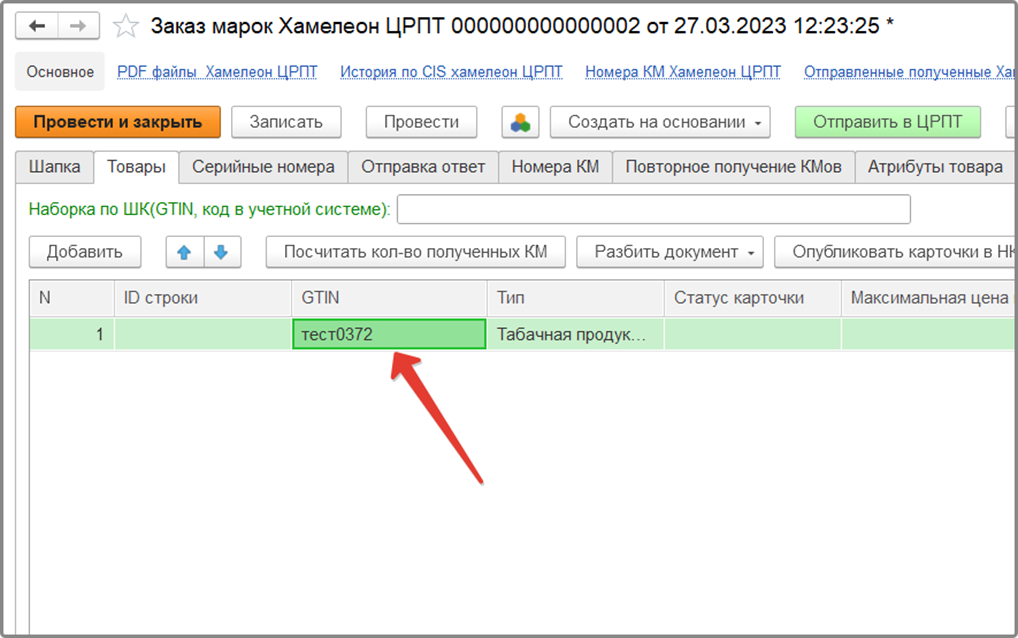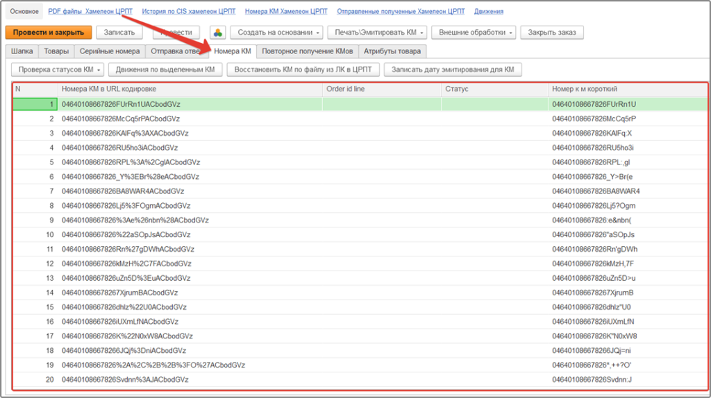 Откройте документ и перейдите на вкладку «Номера КМ». Здесь будут отображаться все коды маркировки