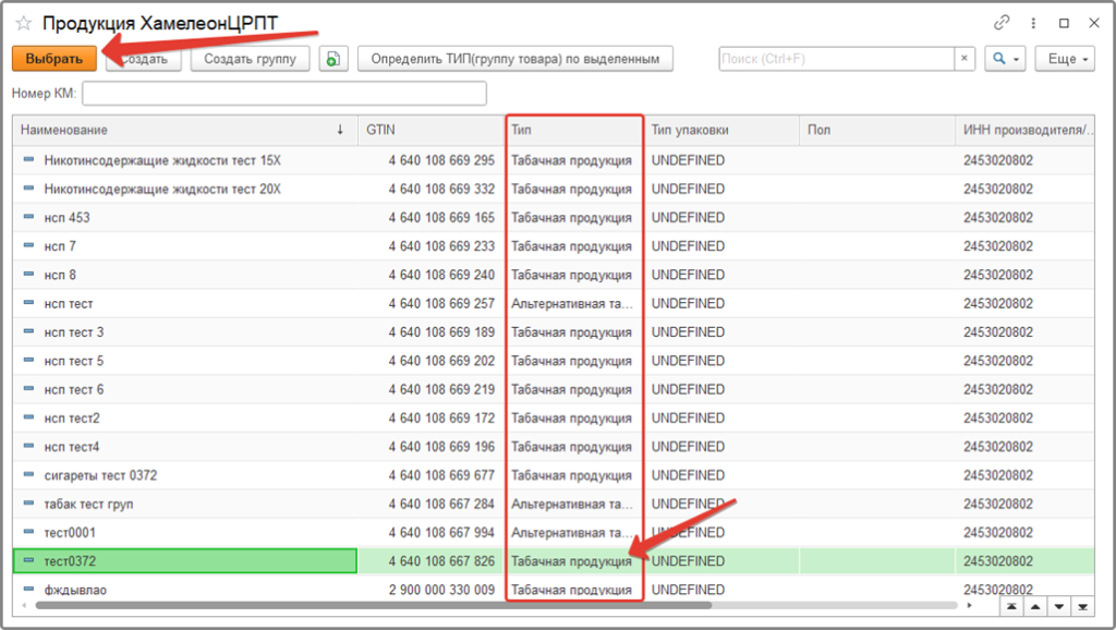 Откроется окно списка продукции. Выберите один или несколько товаров, соответствующих товарной группе, указанной в настройках организации (Никотиносодержащая продукция, альтернативная табачная продукция, табачная продукция), затем в верхней части окна нажмите кнопку «Выбрать».